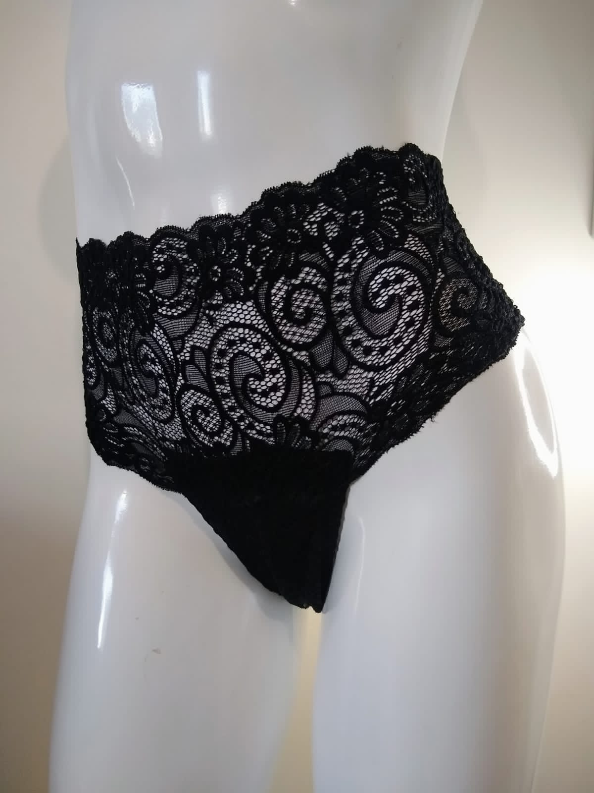 Calcinha caleçon de renda em cintura alta.