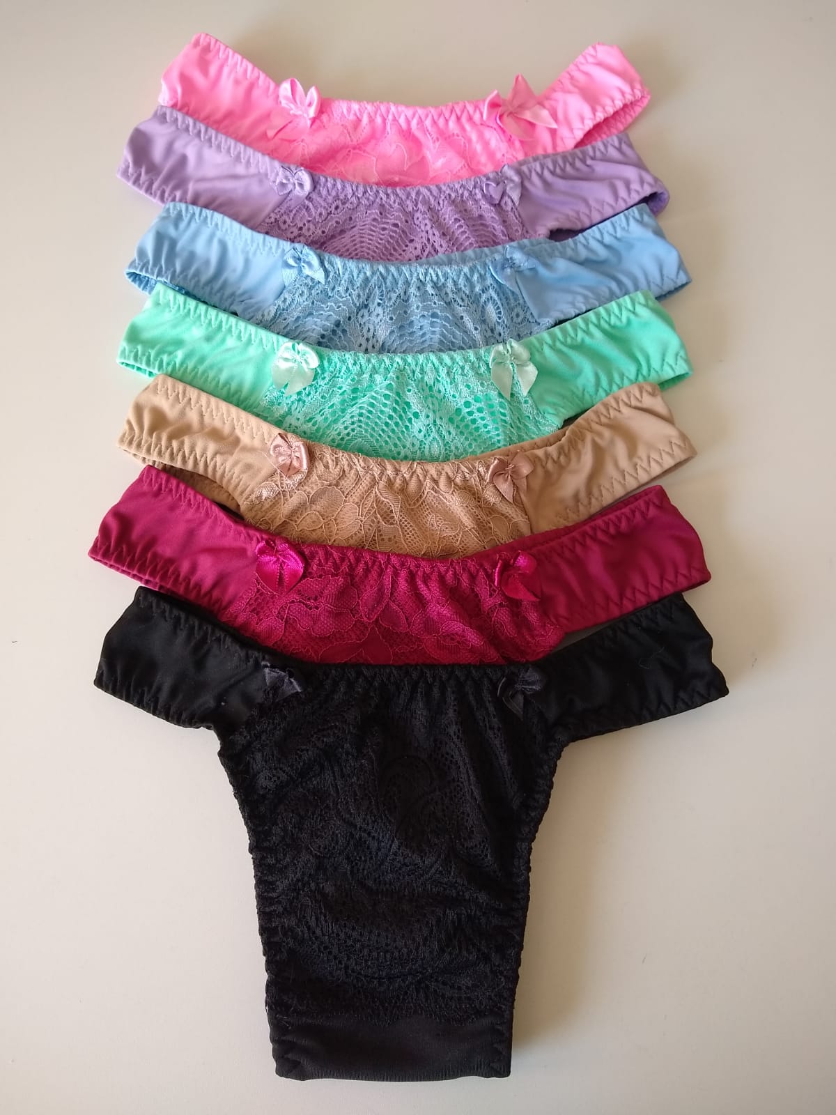 Calcinhas com renda e alça larga, com o fundo mais largo.